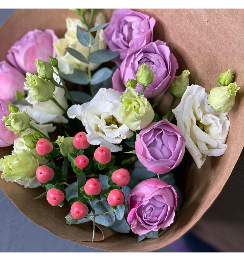Утонченный букет из пионовидных роз — это нежное и стильное творение природы. Гармоничное сочетание лавандер баблс и других компонентов, таких как гиперикум, эвкалипт и эустома, создает прекрасную и изысканную композицию. Этот уникальный букет станет оригинальным подарком для создания моментов, которые останутся в сердце получателя на долгие годы, и позволит выразить чувства и привязанность вашим близким.